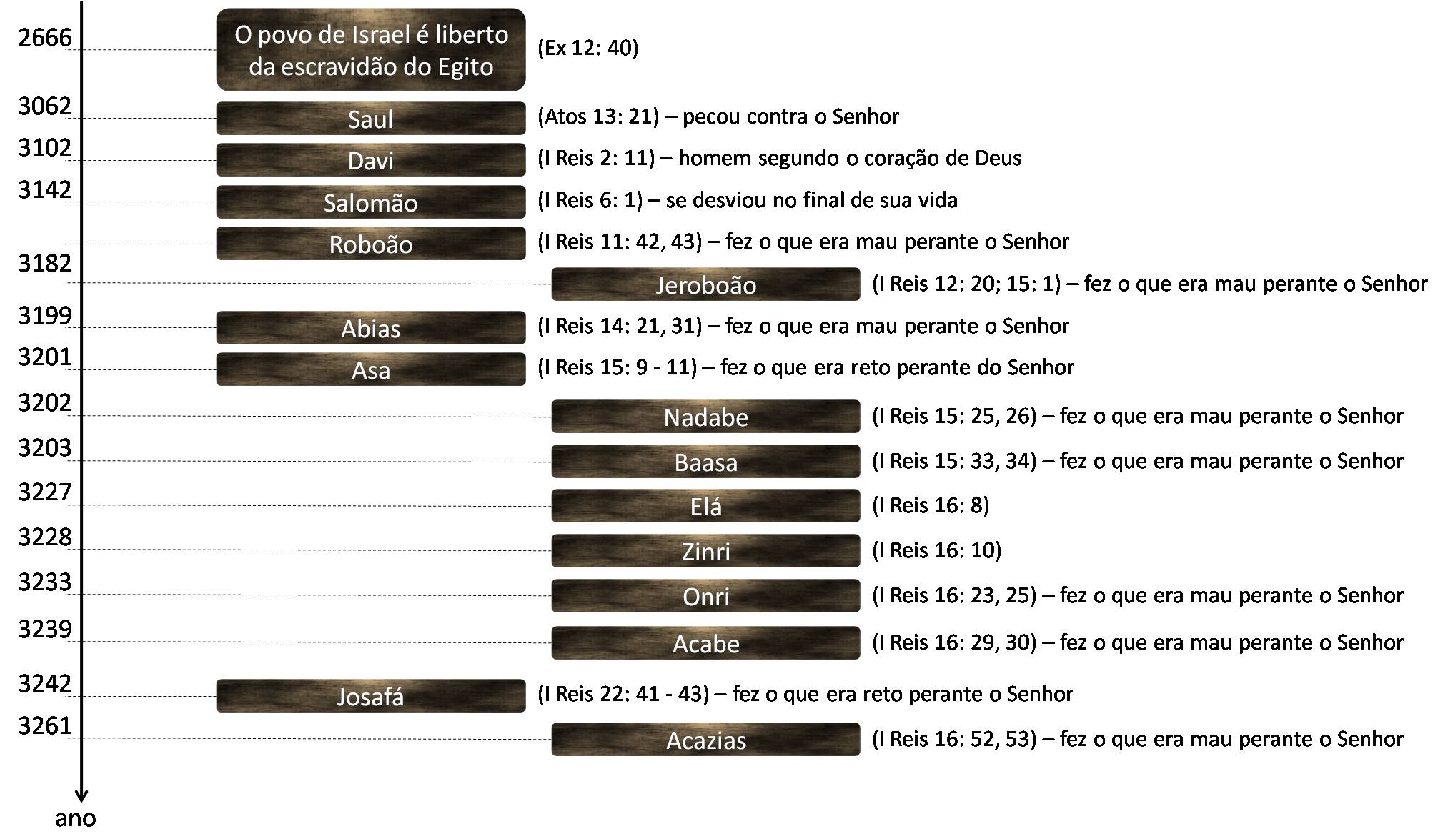 A cronologia de I Reis, o tempo está em relação a criação (o ano zero é na criação). Quando o reinado de Israel é dividido, os reis de Judá permanecem no lado esquerdo e os reis de Israel no lado direito.